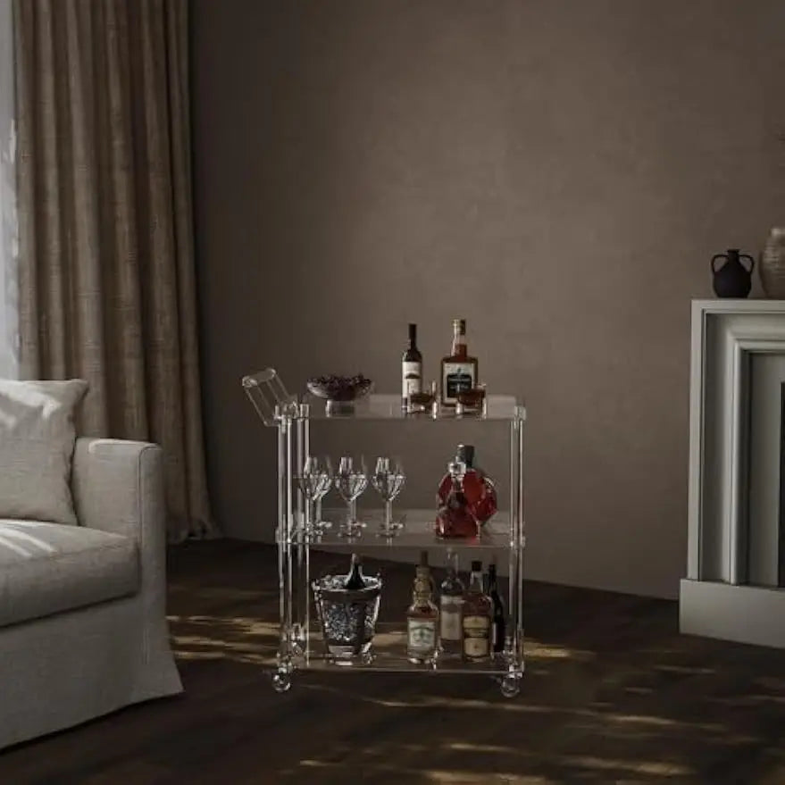 Acrylic Bar Cart with 4 Lockable Wheels, 30.5" L x 15.2" W x 34.5" H, Rolling Serving Cart, Modern, 3-Tier, Clear