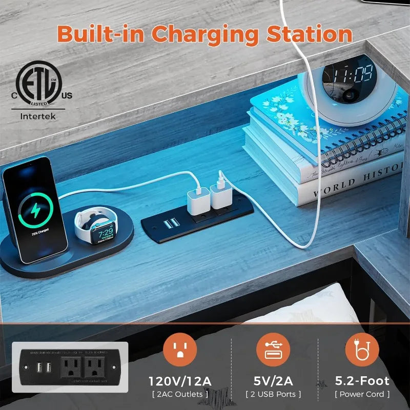 Corner Twin Bed Frame with Bookcase Storage and Led Lights